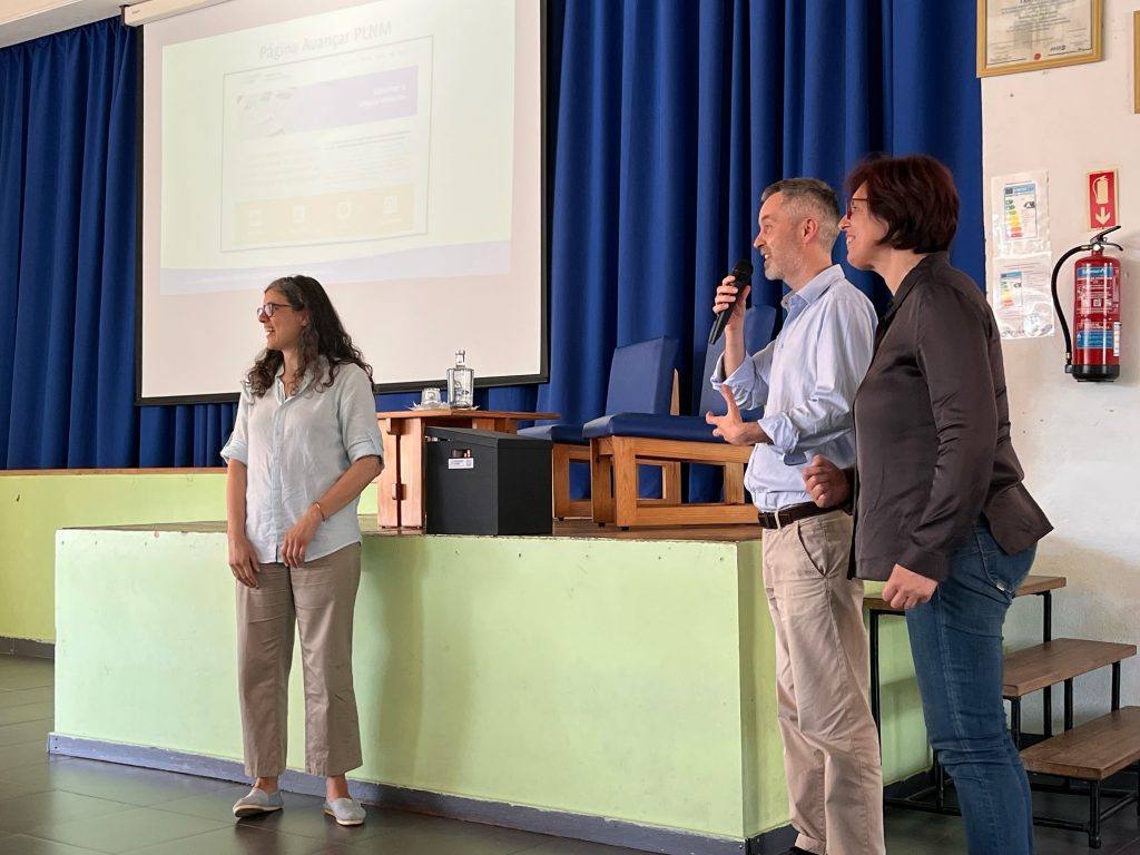 Marta Alexandre (à esquerda) e Fausto Caels (à direita), do programa Avançar PLNM. Anabela Soares (ao centro), diretora do Agrupamento de Escolas de Arganil.