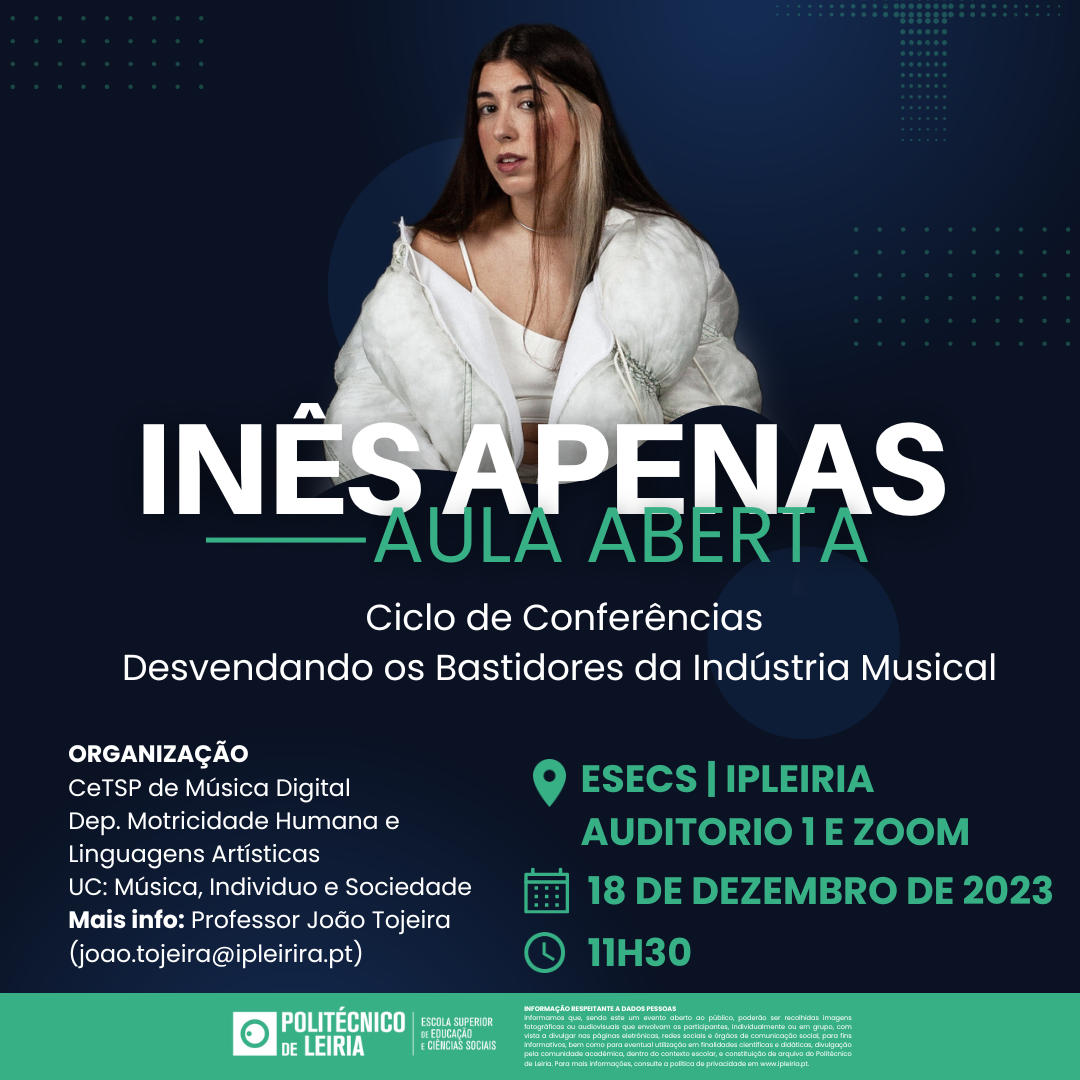 Em resumo, a aula aberta na ESECS – IPLeiria com Inês Apenas foi um mergulho fascinante no universo da indústria musical. Agradeço à instituição por abrir espaço para discussões tão enriquecedoras e inspiradoras. Que eventos como este continuem a motivar e orientar os futuros profissionais que aspiram deixar sua marca no mundo da música.